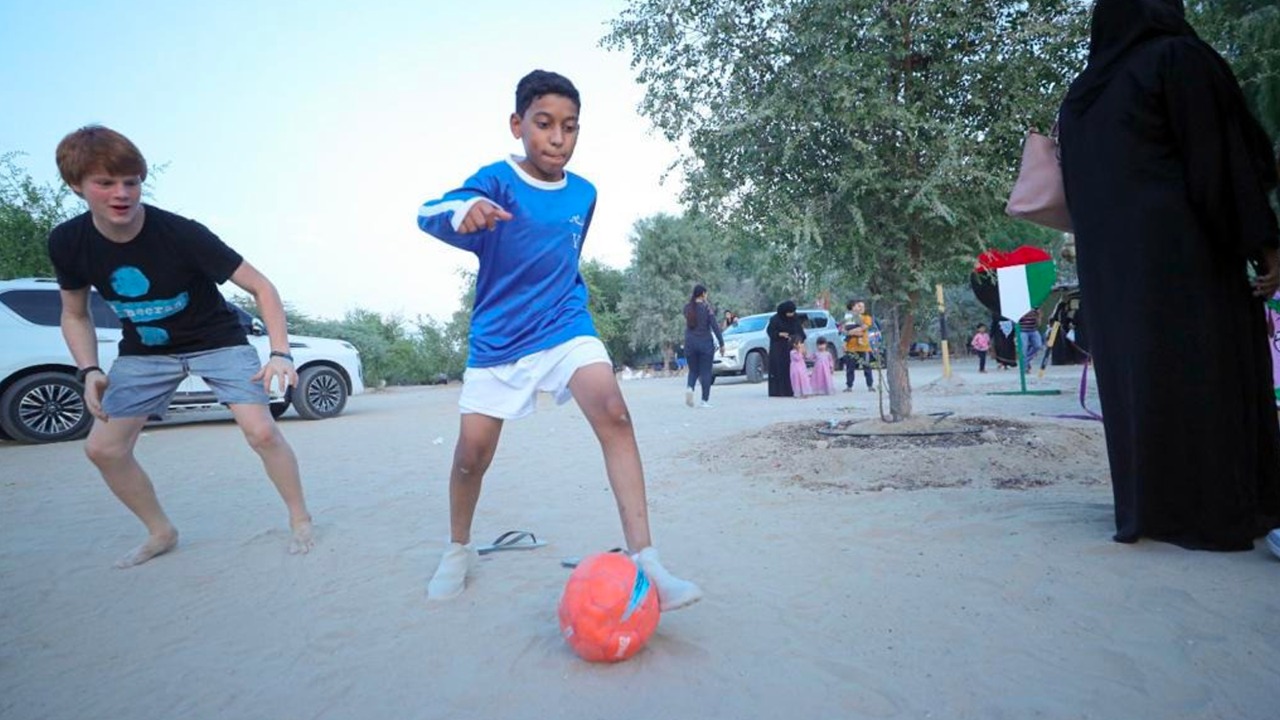 The youth team wore the old Al Nasr shirt, holding the reins of a camel caravan and some on old jeeps, accompanied by the words and sayings of the late Sheikh "Zayed", may God rest his soul, and the melodies of the first voice of the Emirates, "Jaber Jassim", and they exchanged greetings during the march, with the visitors of Al-Qudra Lake with all happiness and joy.