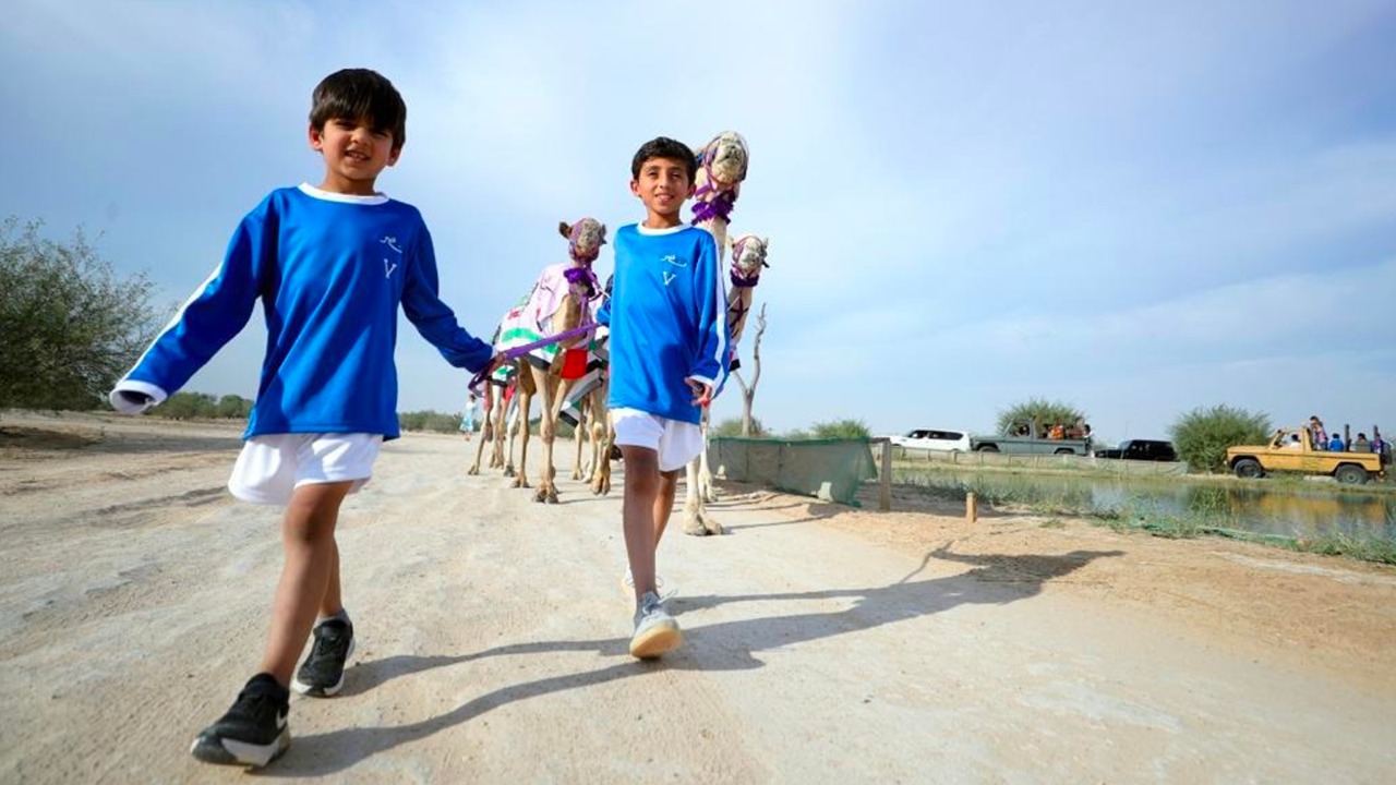 Where a team of the academy's juniors took the reins of the convoy consisting of 7 camels draped with UAE flags, symbolizing the leadership of Al-Nasr Club in the football field in the UAE, as the dean of sports clubs. The female students of Saada Governmental School and the ladies of Al-Asuf Center participated in the convoy's journey.