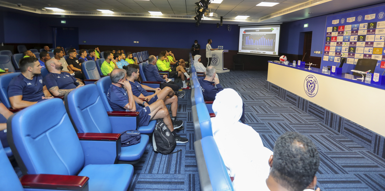 The players of our first football team, the Under 21years team, and the technical and administrative staff of the two teams participated in the refereeing workshop that was held in cooperation with the UAE Football Association and the UAE Pro League.