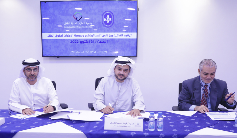 In his part, Counselor Faisal Al-Shammari, Chairman Emirates Child Protection Association, praised Al-Nasr Club, stressing that this partnership will be a role model for other sports institutions to provide this distinguished practice, and it is hoped that they will adopt this qualitative Initiative , which is the first in the Arab world. He also praised the competence and professionalism of Al-Nasr Club, which will contribute to consolidating its prestigious position as a civilized and cultural platform for sports institutions in UAE and the region, as a distinguished model in child protection to face any current or future challenges in this field with regard to the sports environment and related child care in events. or during transportion , and our partnership will set a cornerstone and model for other organizations that we will seek to emulate with practices that are or are being implemented.