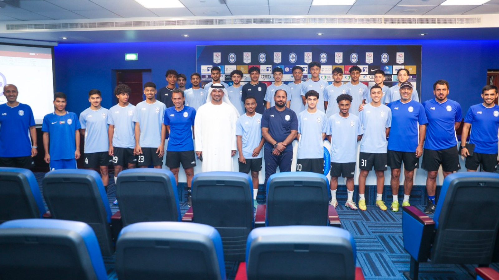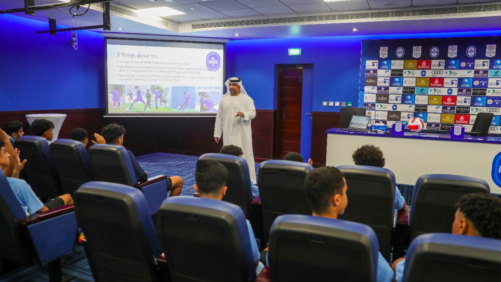 The Football Academy at Al-Nasr Club organized an educational lecture entitled (What is professionalism) for the players and administrators of the Under 18 team. The lecture was delivered by Mr. Ahmed Al-Tayeb, Director of the Professional Sector at the Football Company, in which he gave an explanation to the players about the concept of professionalism, which includes respect for colleagues in the club and school. As well as adhering to training times, adhering to the instructions and instructions of administrators and coaches, and honorably representing the club at all times.