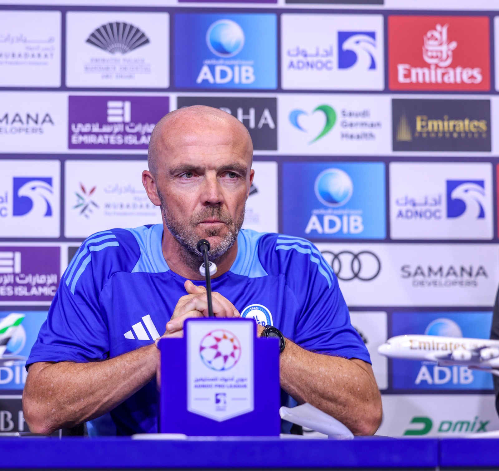 Regarding absences, Schreuder explained that the team will miss the services of Abdullah Al-Tamimi due to injury, along with Abdullah Idris and Abdulrahman Al-Hamadi, who are tied to loan agreements with Al Jazira. He also mentioned that Harris is still suffering from severe pain following his injury in the match against Al Wasl and has not yet rejoined the team for full training.