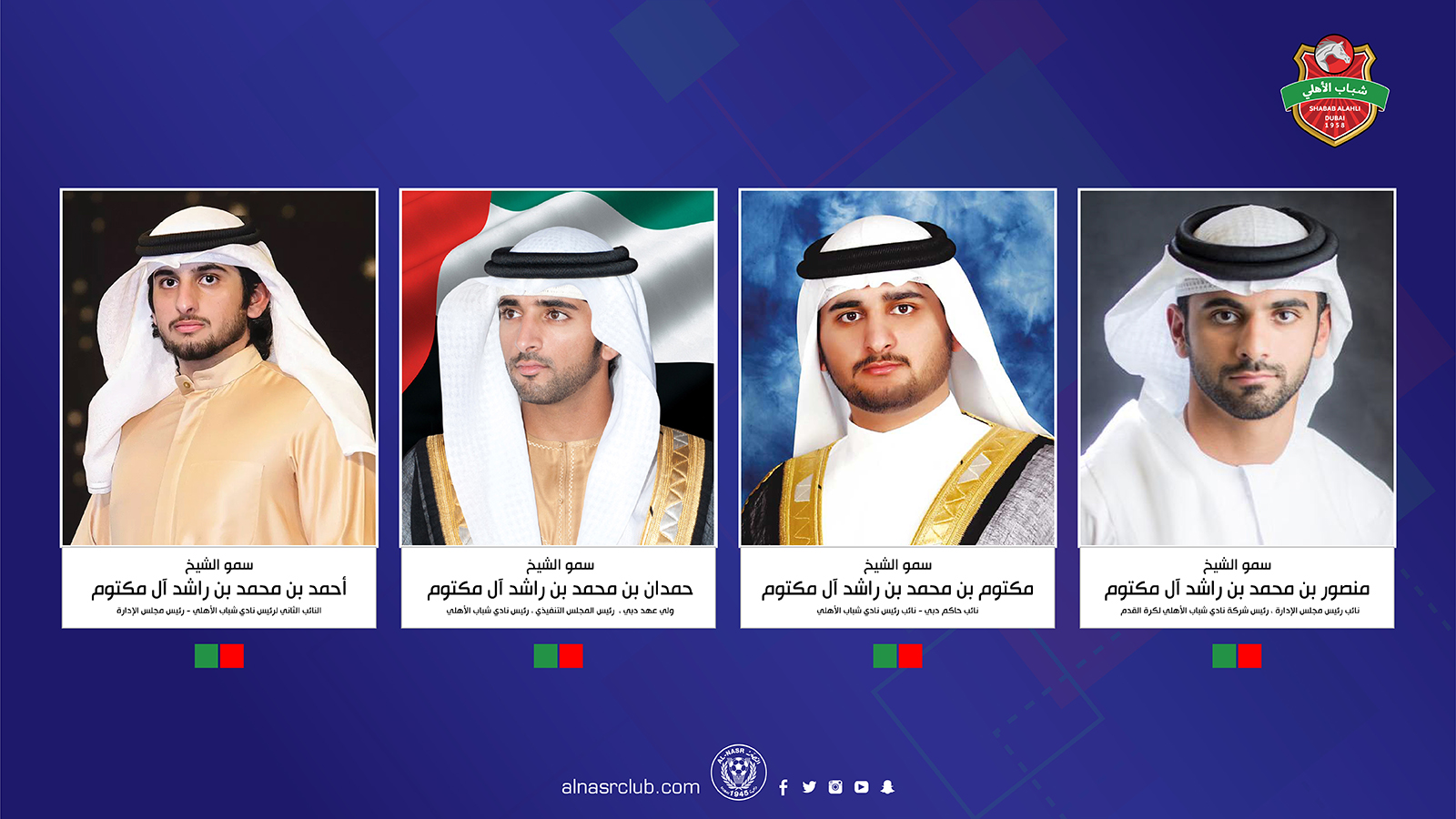 H.H. Sheikh Rashid bin Hamdan bin Rashid Al Maktoum, Chairman of Al Nasr Cultural & Sport Club, also congratulated to His Highness Sheikh Mansour bin Mohammed bin Rashid Al Maktoum, Vice Chairman of Shabab Al Ahli Club with the confidence that His Highness Sheikh Hamdan Bin Mohammed Bin Rashid Al Maktoum Maktoum, Crown Prince of Dubai, Chairman of the Executive Council, President of Al Shabab Al Ahli Club gave them, and His Highness appointment as President of the Football Company.