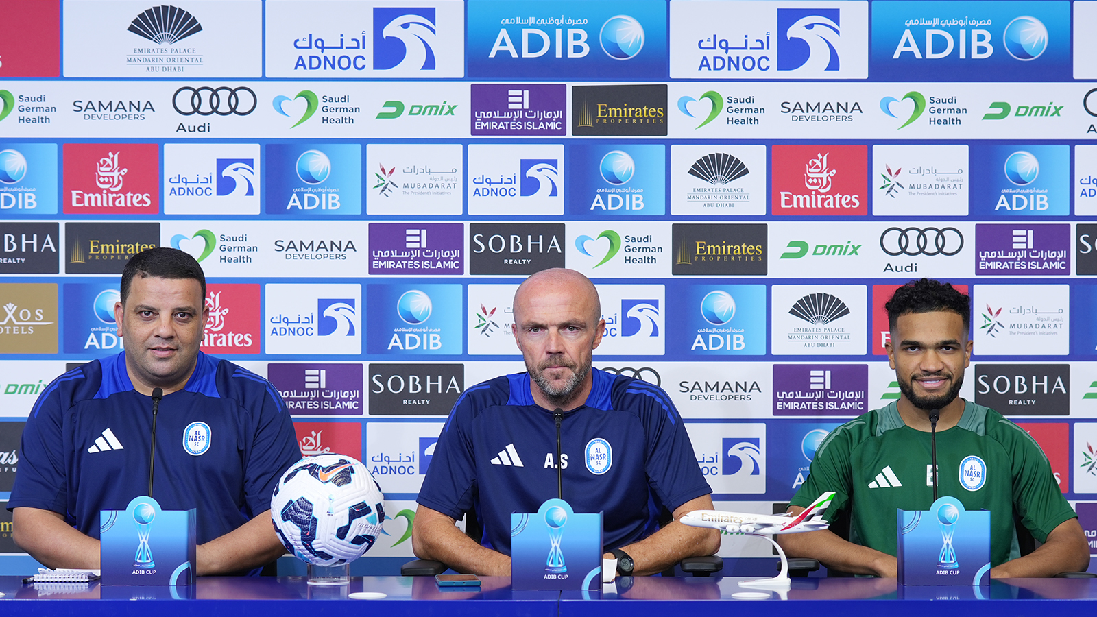 The press conference for the Al-Nasr vs. Al-Orooba match, part of the second leg of the first round of the Abu Dhabi Islamic Bank Cup, took place today at Al Maktoum Stadium's press conference hall. Attending the conference were Mr. Alfred Schreuder, Technical Director of the Al-Nasr football team, and player Hussein Mahdi.