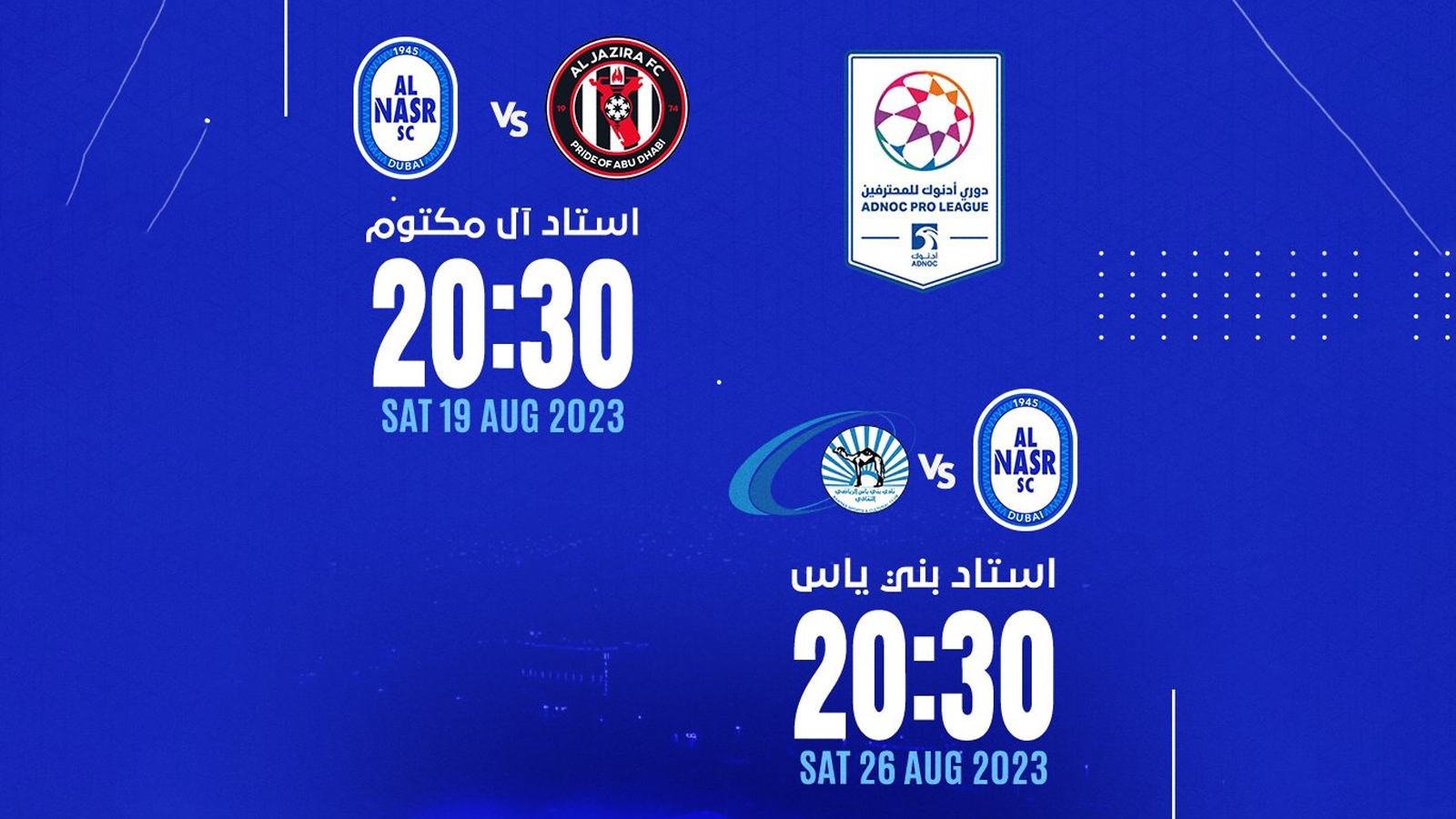 In the first round of ADNOC Pro League , al Nasr will face AL Jazira at Al Maktoum Stadium on 19 August , and play against Baniyas at Baniyas Stadium in 26 of the same month .