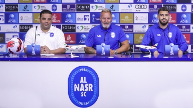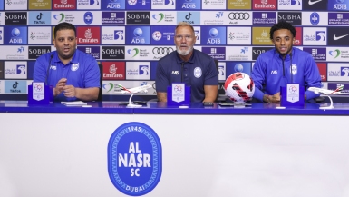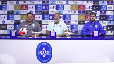 At the introductory press conference for the match between Al Nasr and Ittihad Kalba in the eighth week of ADNOC Pro League, which will be played at 8 pm on Saturday, October 29 at Ittihad Kalba Stadium, Mr. Thorsten fink, the coach of our football first team, spoke about the team's preparations for the match, and he was accompanied by Al Nasr's player Glauber Lima .